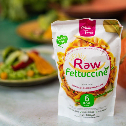 Nuestra pasta está elaborada con glucomanano: una fibra vegetal baja en calorías. RawPasta no contiene grasa, gluten ni azúcar y sólo contiene 6 kcal por cada 100 gramos de pasta.